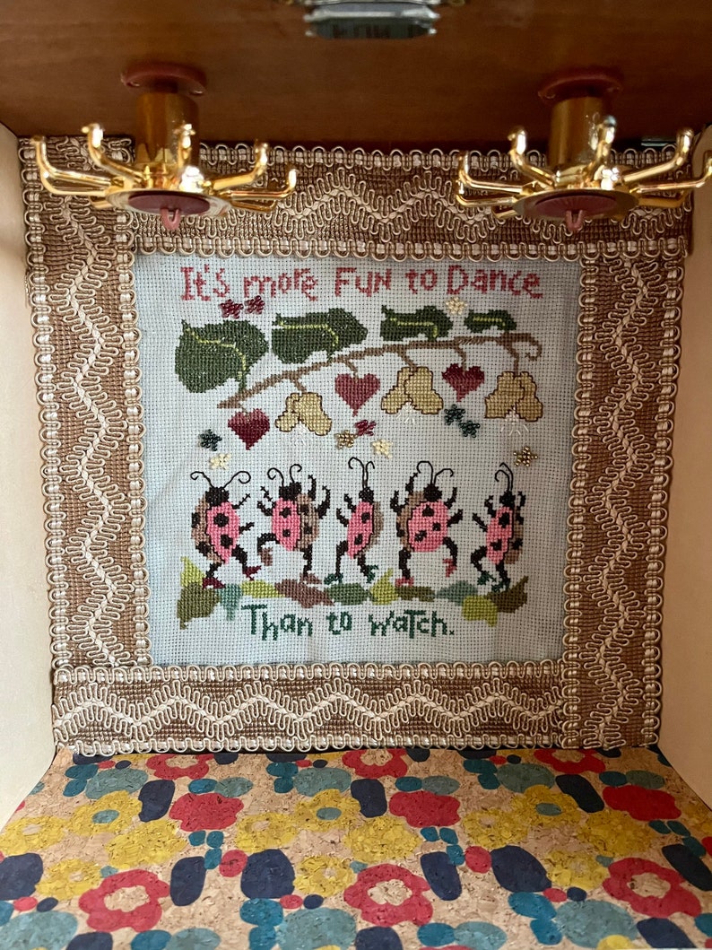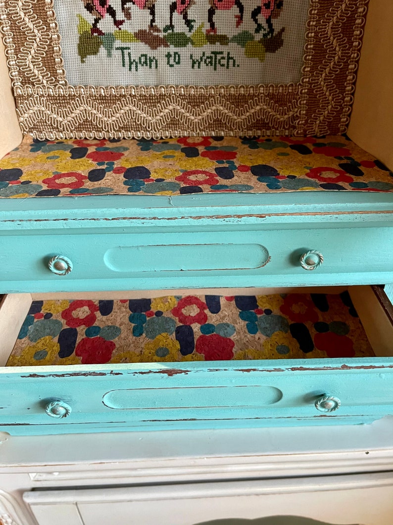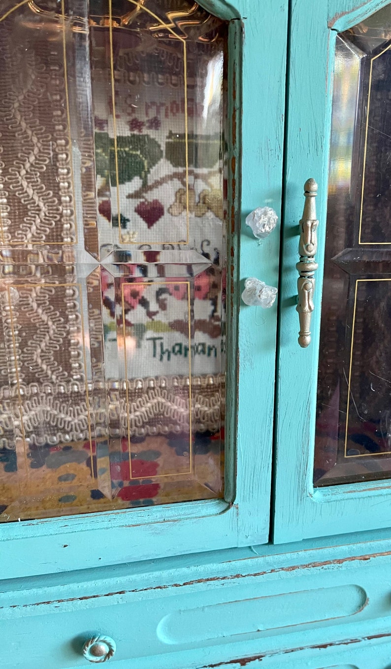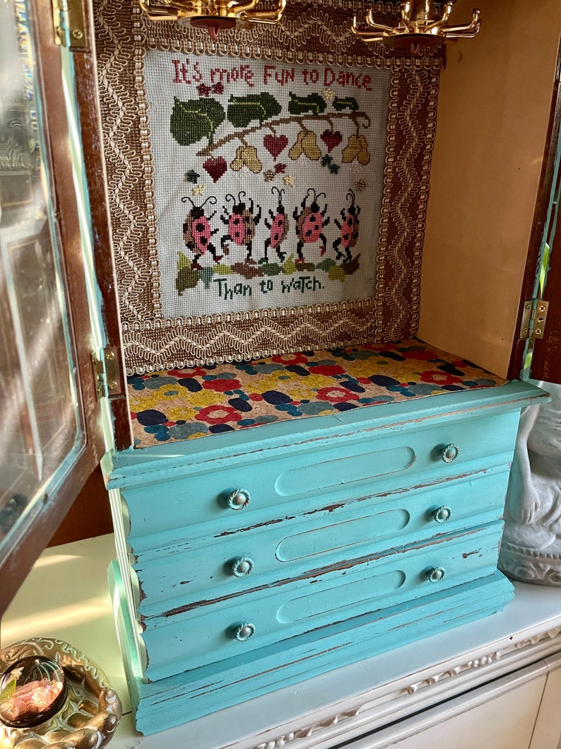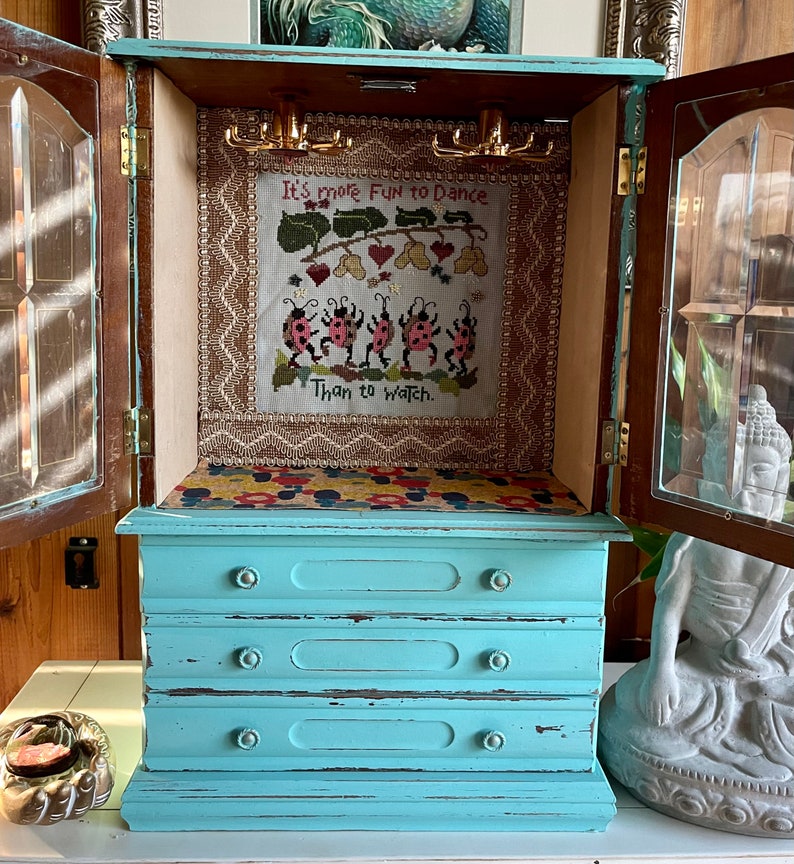 I created this counted cross stitch in the early 2000's which it makes it a vintage piece as well as the cabinet.