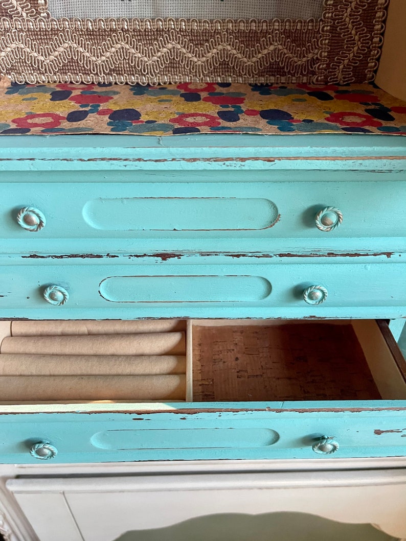 The drawers have a funky cork fabric giving the entire piece an eclectic vibe.