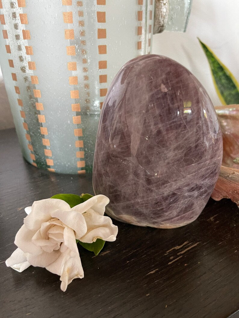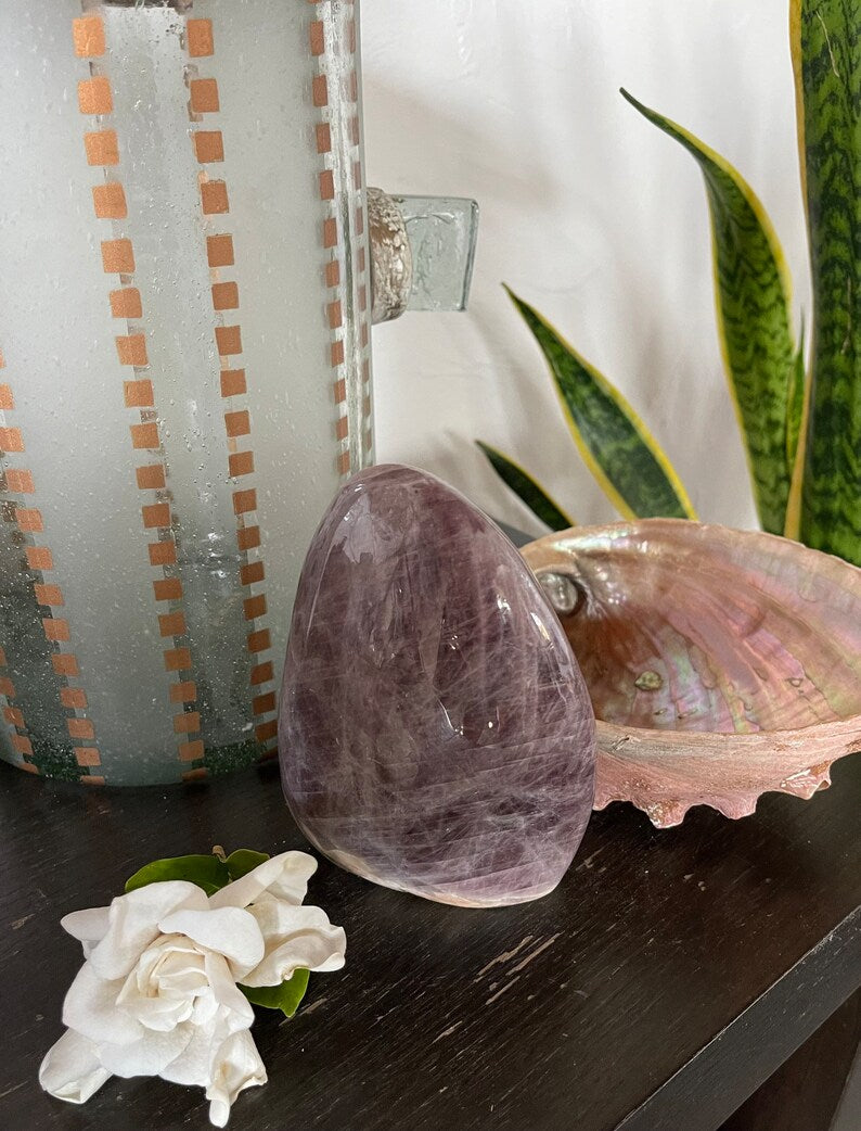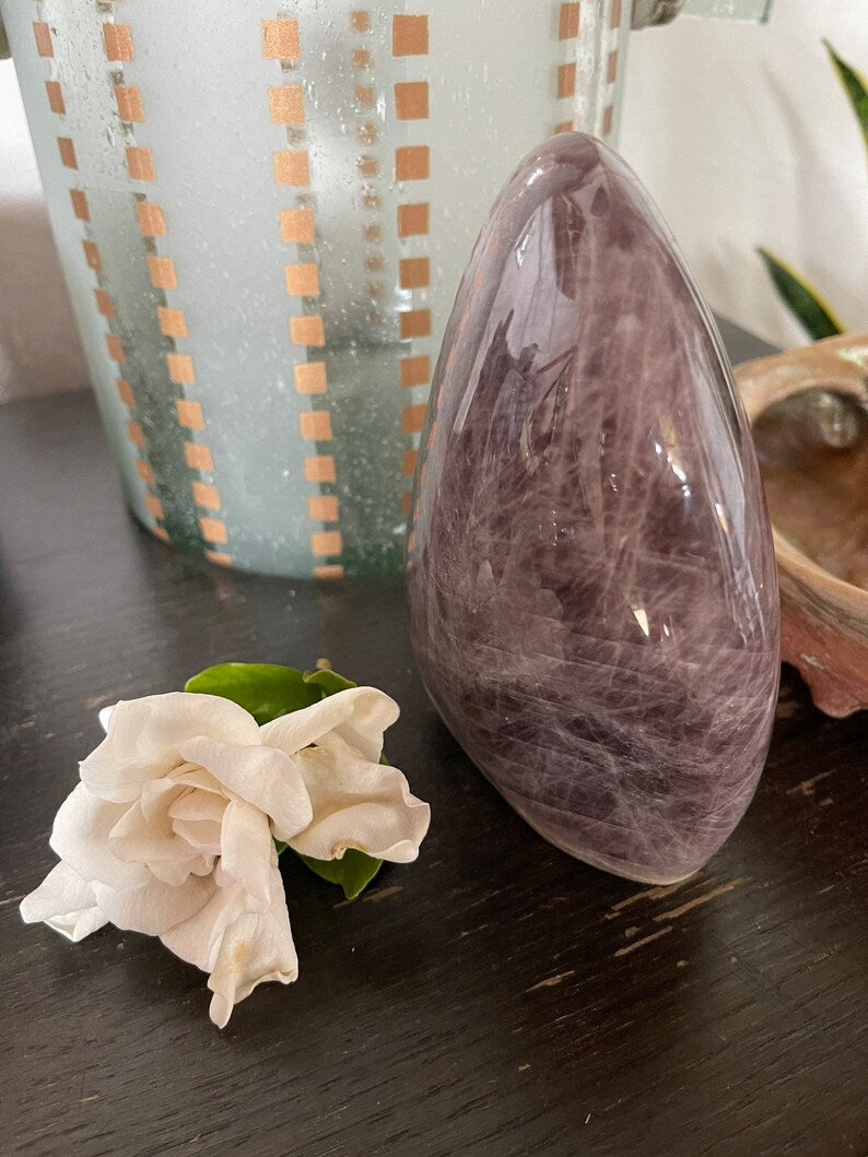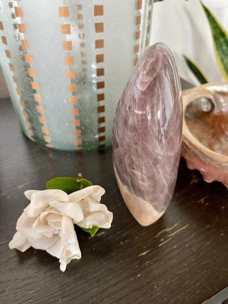 Purple Anhydrite is a fluid energy that facilitates the present moment. It’s supportive of transformations, and is so gentle. This stone helps us open our crown chakra energy so we can connect with the angelic and higher realms. It works with our unconscious to release old patterns.