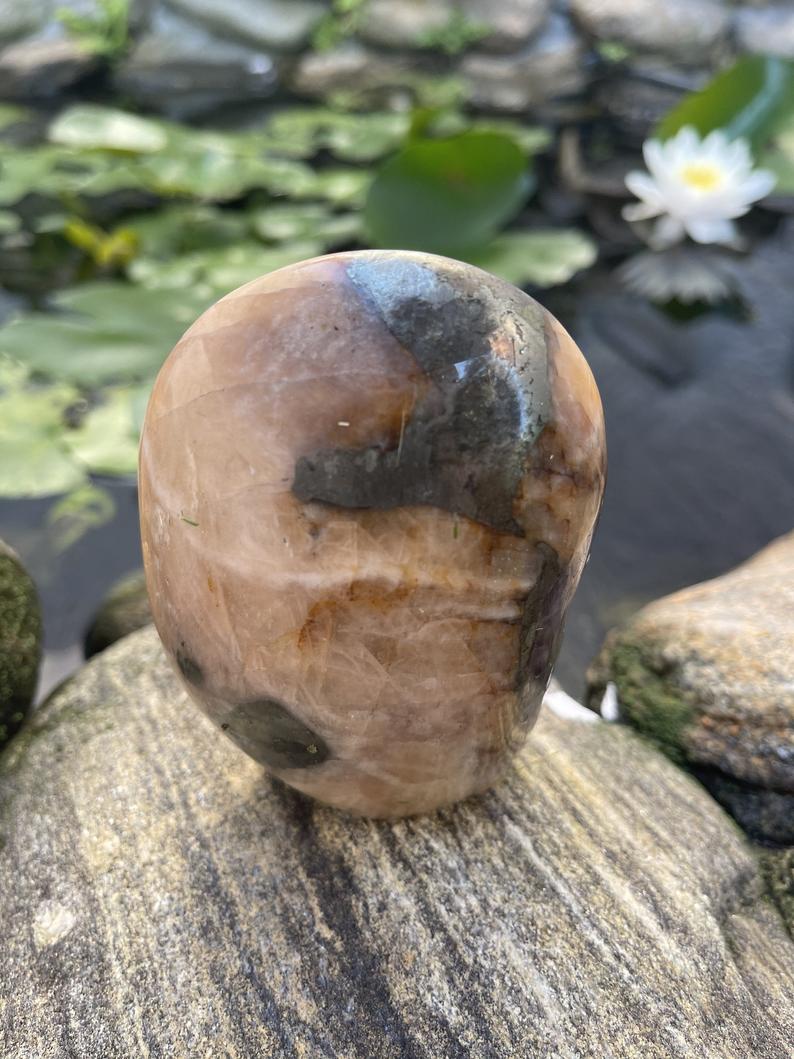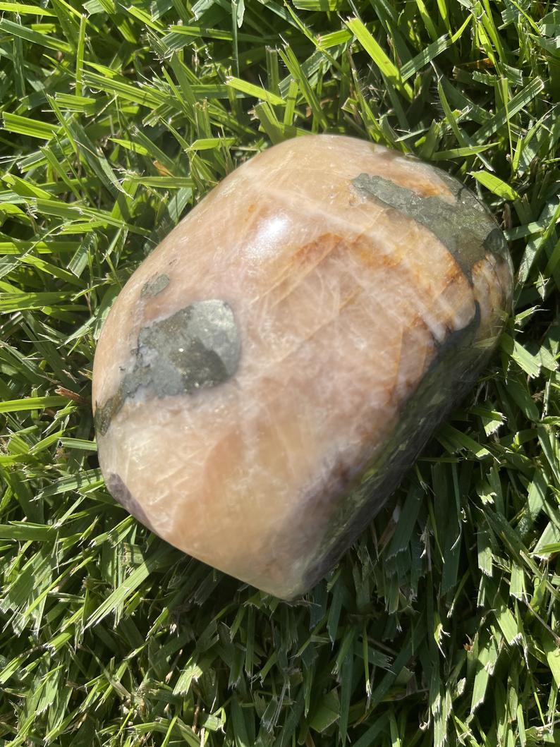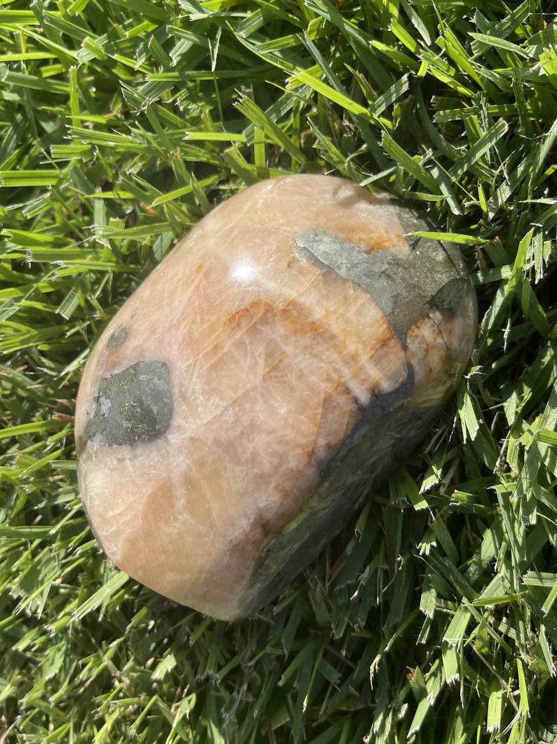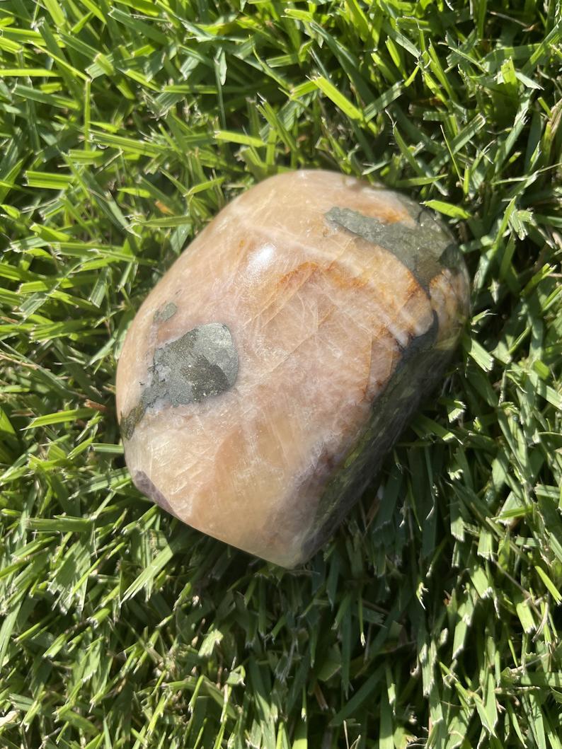 A one of a kind piece! Anhydrite is a very rare form of Gypsum that forms when all water evaporates from it. The blue form of Anhydrite is Angelite. There is a beautiful translucency to the piece, and the peach calcite makes it even more unique. It’s really beautiful energy and this piece has a nice vibration.
