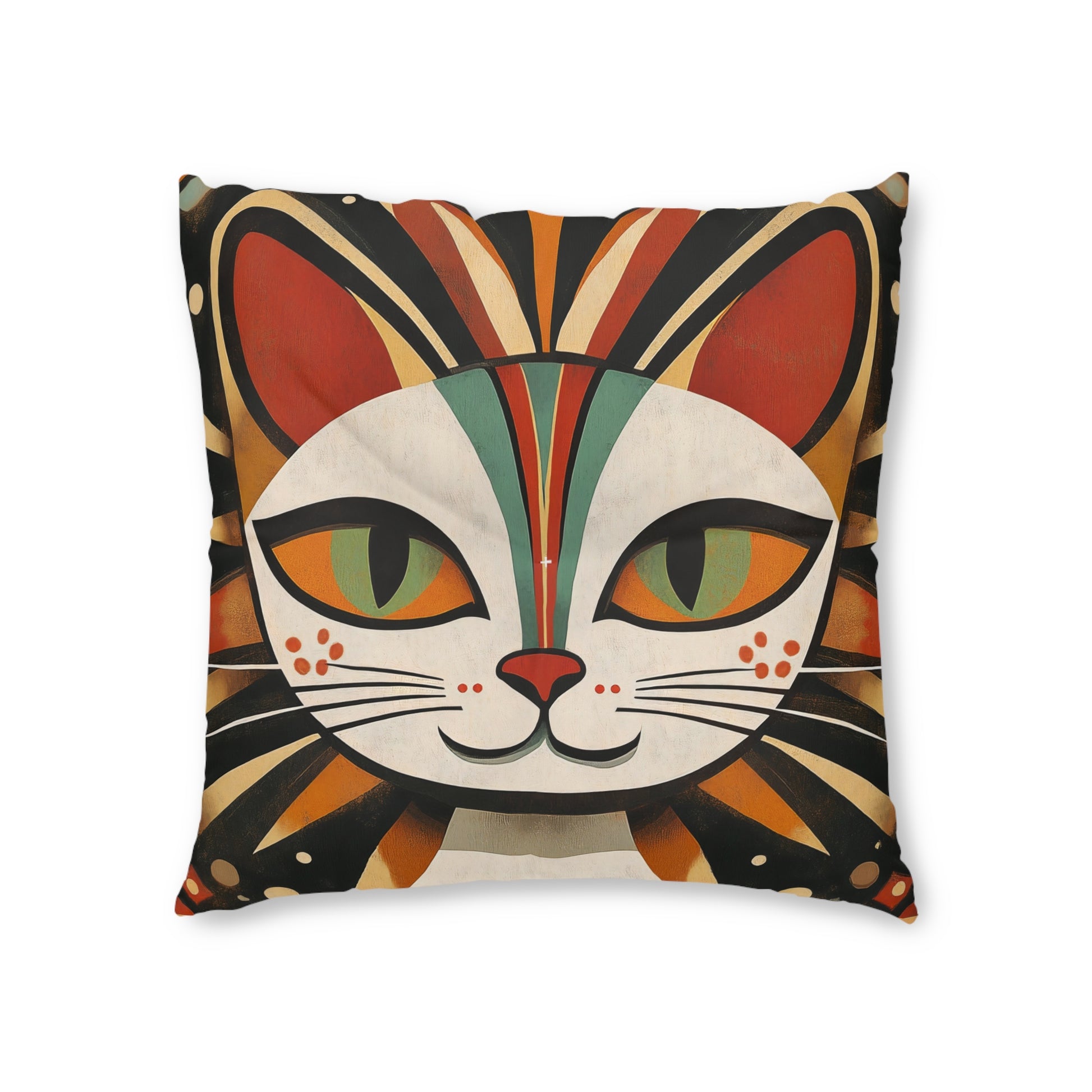 A sunlit corner come alive — this tufted floor pillow shows a stylized, confident cat face in warm autumn tones and graphic, folk-art lines. The double-sided print keeps the pattern readable from every angle, while the sturdy polyester fill holds shape for low seating, lounge reading, or a relaxed game night on the floor. Place it by a window, tuck it against a sofa, or layer it in a cozy reading nest; the bold eyes and painterly stripes bring playful energy and a handcrafted look to small living rooms, studio apartments, or kid-friendly dens.