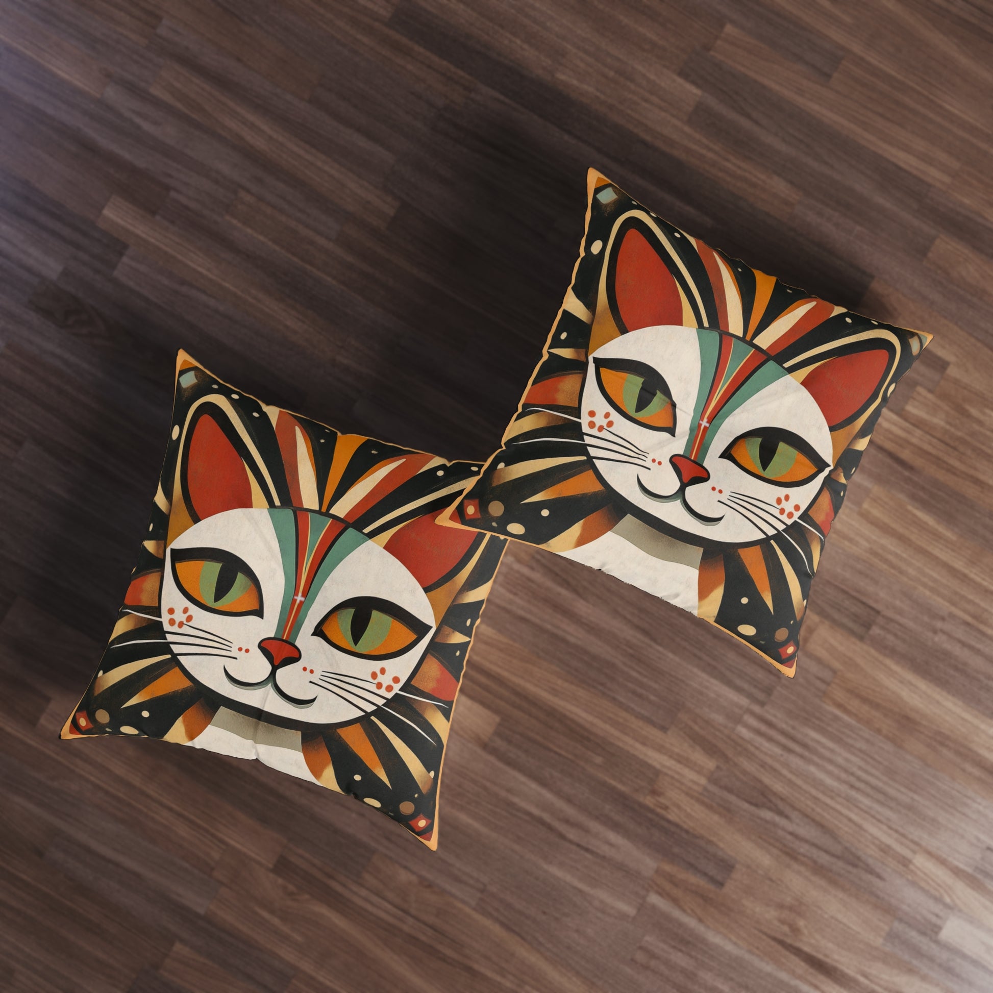 Retro Mid Century Modern Colorful Cat Face Tufted Floor Pillow | Square