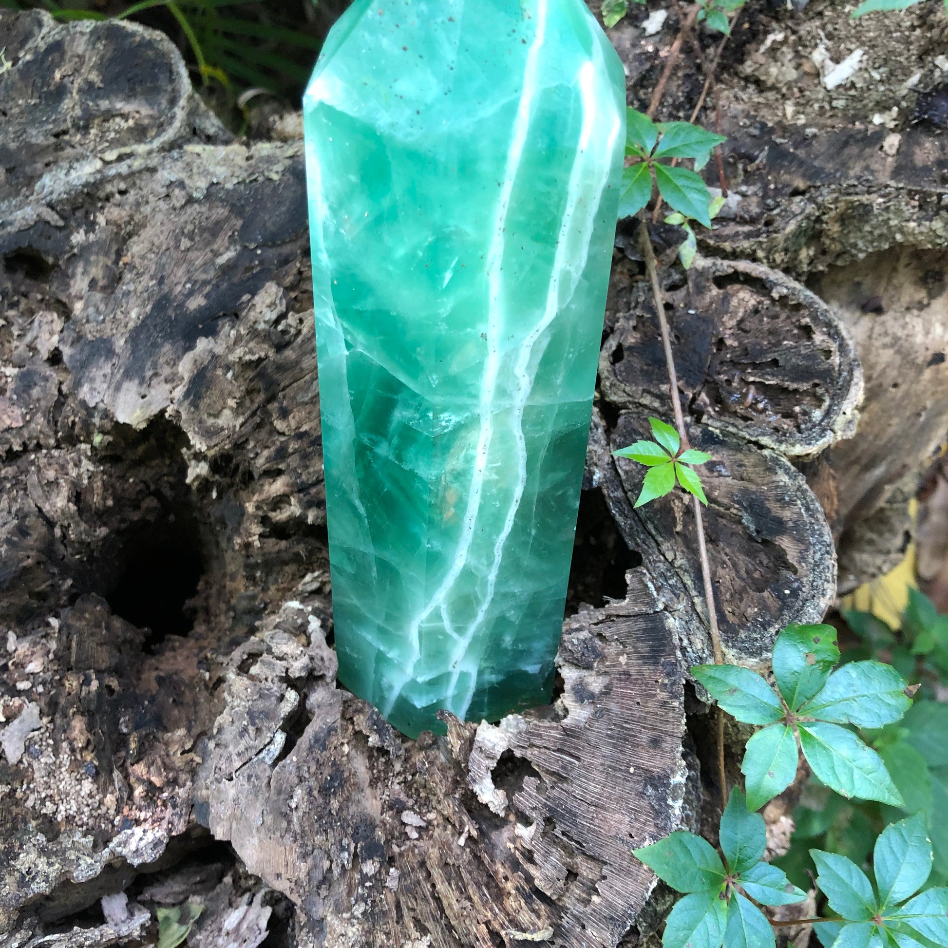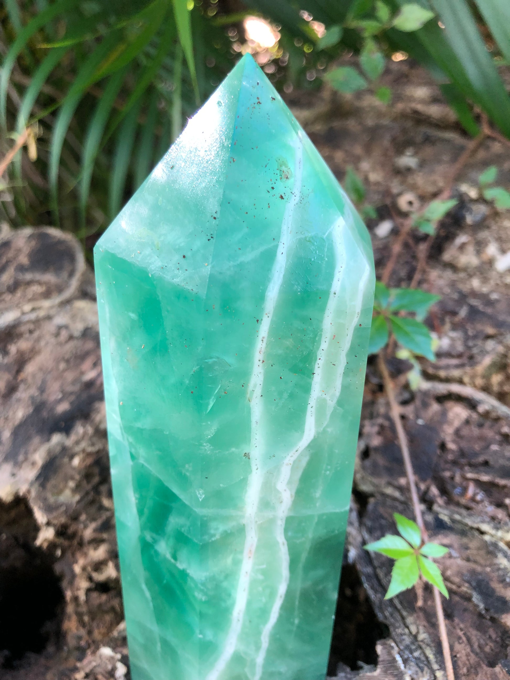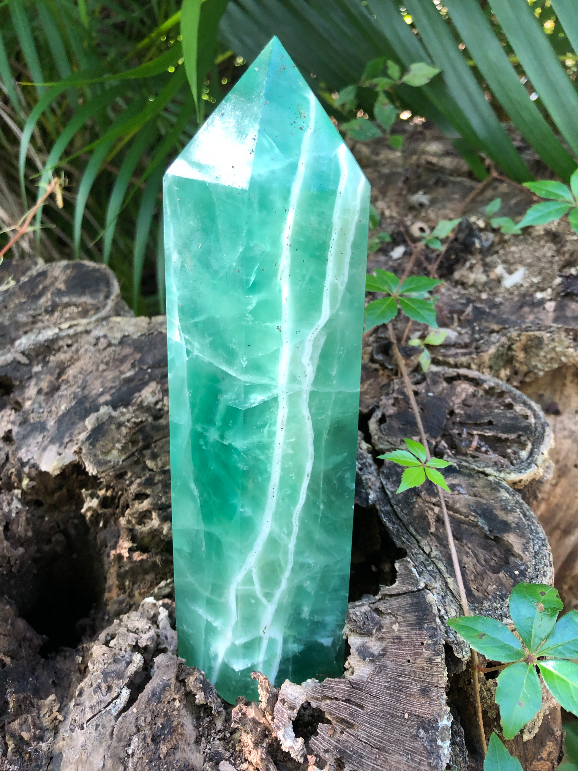 This fluorite obelisk is AMAZING! I love the white vein running through it that looks like a lightning strike. This tower is truly a magical work of art!