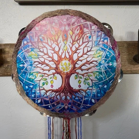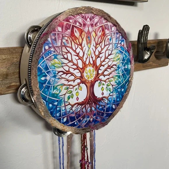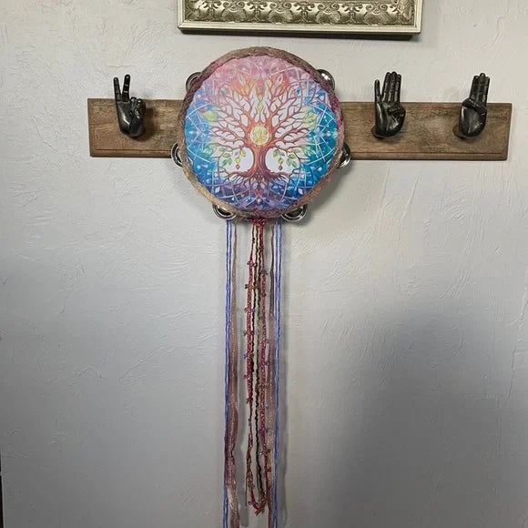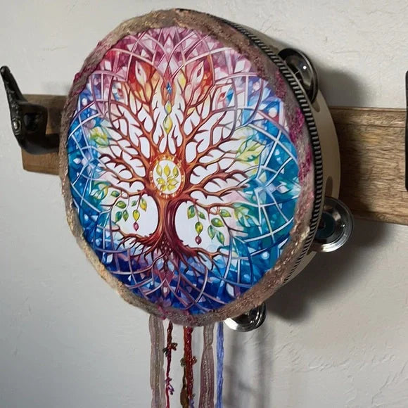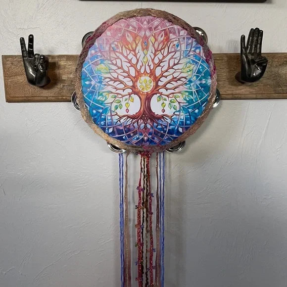 This is a beautiful mixed media original artwork design decoupaged on a real tambourine. Tambourine measures approx 8" in diameter.