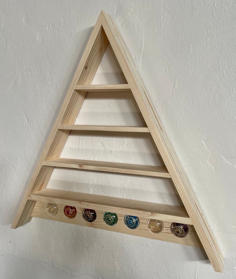 This is a large pine triangle with lots of room for crystals. Extra metaphysical energy with the chakras placed below. This could also be lighted from behind as the disks are suspended in the holes.