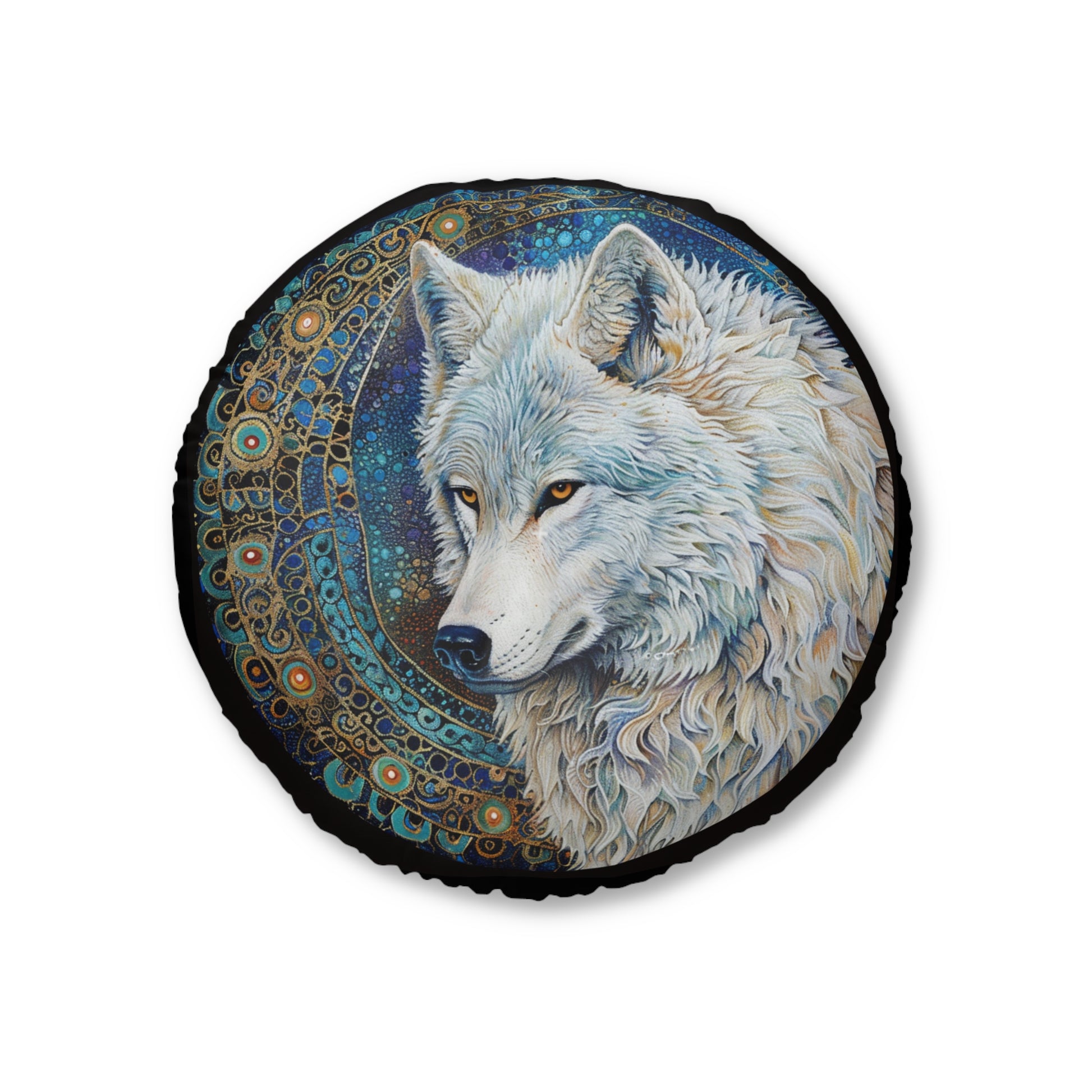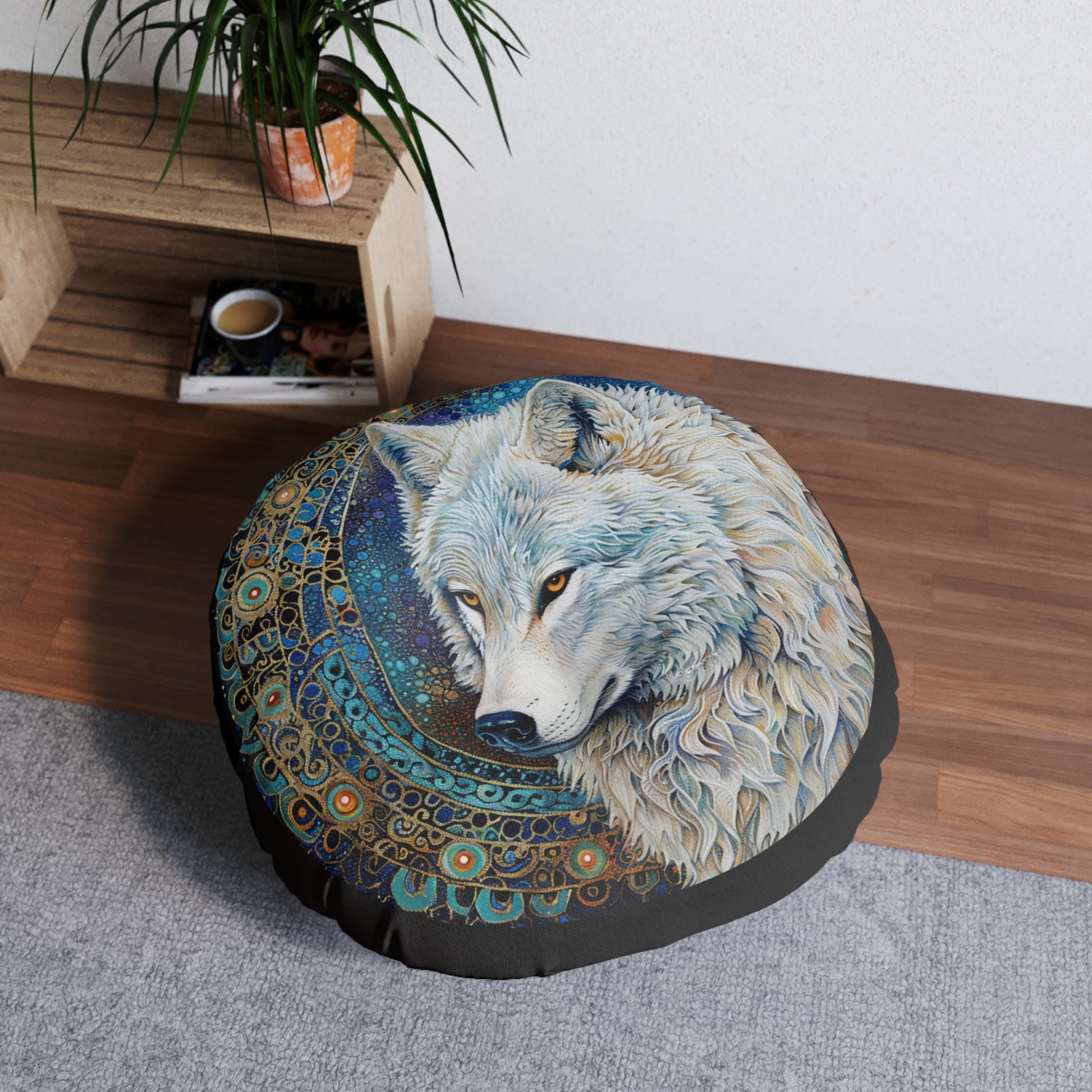 Wolf Print Tufted Floor Pillow, Round Decorative Cushion, Cosmic Home Decor, Nature-inspired Throw Pillow, Boho Living Room Accent